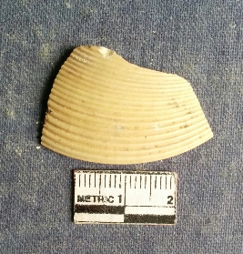 | Description / विवरण | The shell piece is pale white in color. It has surface striations on account of its natural formation. The piece has cut edges with angular points and some surface aberration. The piece is a by product of shell object making process. |