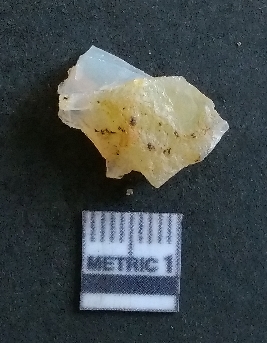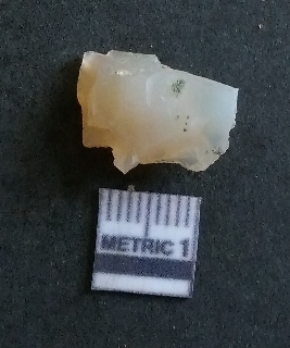 | Description / विवरण | The chalcedony flake is small, with pale coloration and crypto-crystalline matrix. The piece shows prominent flake scars and sharp edges owing to lithic knapping activity. |
