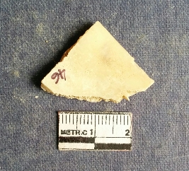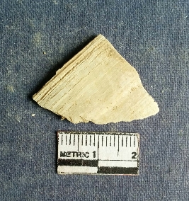 | Description / विवरण | The shell piece is pale white in color. It has surface striations on account of its natural formation. The piece has cut edges with angular points and some surface aberration. The piece is a by product of shell object making process. |