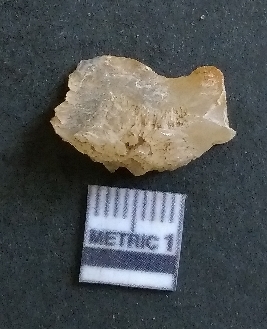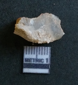 | Description / विवरण | The chalcedony flake is small, with pale coloration and crypto-crystalline matrix. The piece shows prominent flake scars and sharp edges owing to lithic knapping activity. |