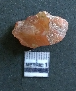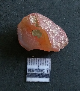 | Description / विवरण | The chalcedony nodule is reddish in colour, and shows battering marks.It has a crypto-crystalline matrix. The piece shows prominent flake scars and sharp edges owing to lithic knapping activity. |