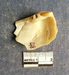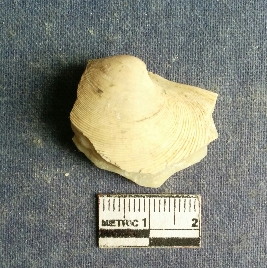 | Description / विवरण | The shell piece is pale white in color. It has surface striations on account of its natural formation. The piece has cut edges with angular points and some surface aberration. The piece is a by product of shell object making process. |