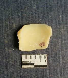 | Description / विवरण | The shell piece is pale white in color. It has surface striations on account of its natural formation. The piece has cut edges with angular points and some surface aberration. The piece is a by product of shell object making process. |