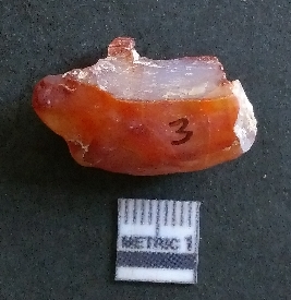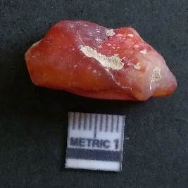 | Description / विवरण | The carnelian piece has flake scars on the surface and sharp flaked edges as a result of flaking. The piece is deep red in colour and crypto-crystalline in nature. The piece is a part of secondary flaking process. |