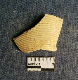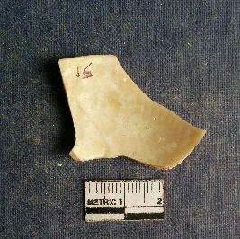 | Description / विवरण | The shell piece is pale white in color. It has surface striations on account of its natural formation. The piece has cut edges with angular points and some surface aberration. The piece is a by product of shell object making process. |