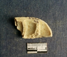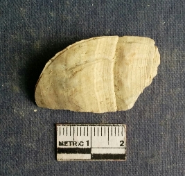 | Description / विवरण | The shell piece is pale white in color. It has surface striations on account of its natural formation. The piece has cut edges with angular points and some surface aberration. The piece is a by product of shell object making process. |