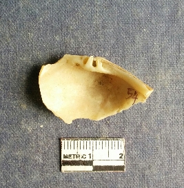 | Description / विवरण | The shell piece is pale white in color. It has surface striations on account of its natural formation. The piece has cut edges with angular points and some surface aberration. The piece is a by product of shell object making process. |