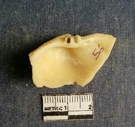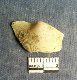 | Description / विवरण | The shell piece is pale white in color. It has surface striations on account of its natural formation. The piece has cut edges with angular points and some surface aberration. The piece is a by product of shell object making process. |