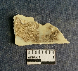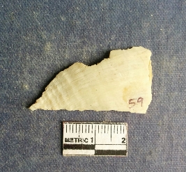 | Description / विवरण | The shell piece is pale white in color. It has surface striations on account of its natural formation. The piece has cut edges with angular points and some surface aberration. The piece is a by product of shell object making process. |