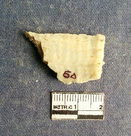 | Description / विवरण | The shell piece is pale white in color. It has surface striations on account of its natural formation. The piece has cut edges with angular points and some surface aberration. The piece is a by product of shell object making process. |