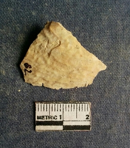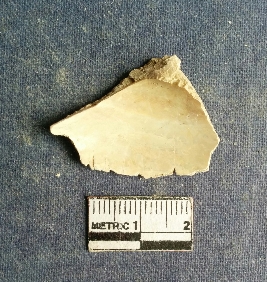 | Description / विवरण | The shell piece is pale white in color. It has surface striations on account of its natural formation. The piece has cut edges with angular points and some surface aberration. The piece is a by product of shell object making process. |