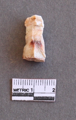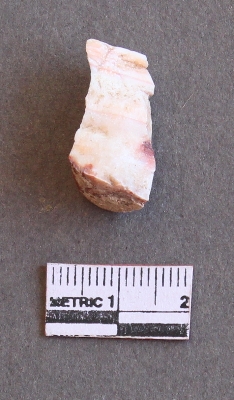 | Description / विवरण | This is a quartz fragment with cortex, opaque with orangish bands. |