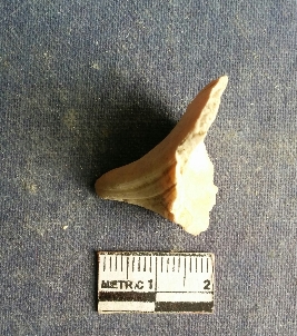 | Description / विवरण | The shell piece is pale white in color. It has surface striations on account of its natural formation. The piece has cut edges with angular points and some surface aberration. The piece is a by product of shell object making process. |