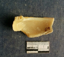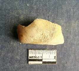 | Description / विवरण | The shell piece is pale white in color. It has surface striations on account of its natural formation. The piece has cut edges with angular points and some surface aberration. The piece is a by product of shell object making process. |