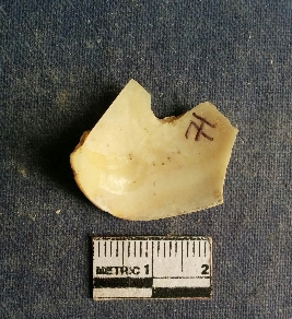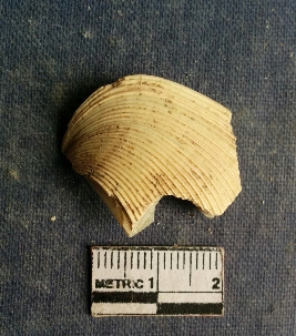 | Description / विवरण | The shell piece is pale white in color. It has surface striations on account of its natural formation. The piece has cut edges with angular points and some surface aberration. The piece is a by product of shell object making process. |