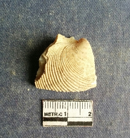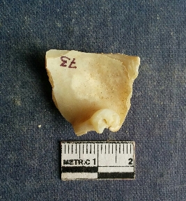 | Description / विवरण | The shell piece is pale white in color. It has surface striations on account of its natural formation. The piece has cut edges with angular points and some surface aberration. The piece is a by product of shell object making process. |