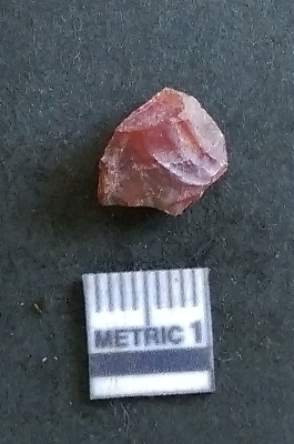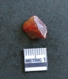 | Description / विवरण | The carnelian piece is red in colour, and has sharp flaked edges on account of lithic knapping. The piece is roughly cuboidal in shape and has angular edges. |