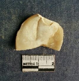 | Description / विवरण | The shell piece is pale white in color. It has surface striations on account of its natural formation. The piece has cut edges with angular points and some surface aberration. The piece is a by product of shell object making process. |