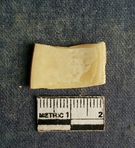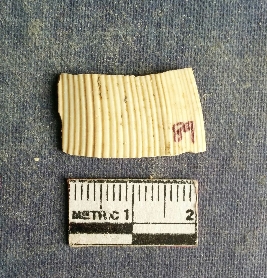 | Description / विवरण | The shell piece is pale white in color. It has surface striations on account of its natural formation. The piece has cut edges with angular points and some surface aberration. The piece is a by product of shell object making process. |
