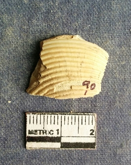 | Description / विवरण | The shell piece is pale white in color. It has surface striations on account of its natural formation. The piece has cut edges with angular points and some surface aberration. The piece is a by product of shell object making process. |