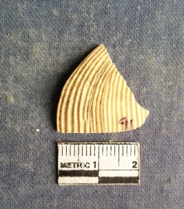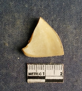| Description / विवरण | The shell piece is pale white in color. It has surface striations on account of its natural formation. The piece has cut edges with angular points and some surface aberration. The piece is a by product of shell object making process. |