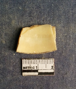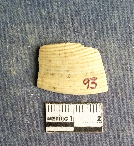 | Description / विवरण | The shell piece is pale white in color. It has surface striations on account of its natural formation. The piece has cut edges with angular points and some surface aberration. The piece is a by product of shell object making process. |