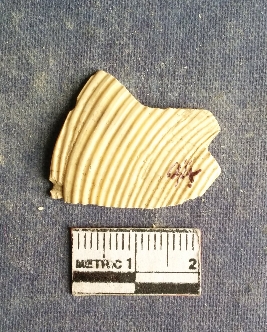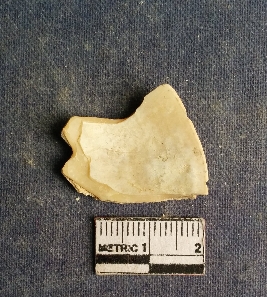 | Description / विवरण | The shell piece is pale white in color. It has surface striations on account of its natural formation. The piece has cut edges with angular points and some surface aberration. The piece is a by product of shell object making process. |