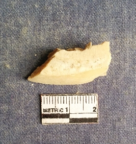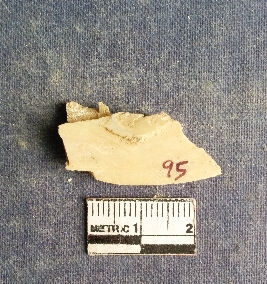 | Description / विवरण | The shell piece is pale white in color. It has surface striations on account of its natural formation. The piece has cut edges with angular points and some surface aberration. The piece is a by product of shell object making process. |
