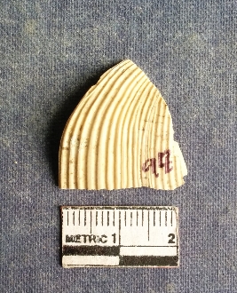 | Description / विवरण | The shell piece is pale white in color. It has surface striations on account of its natural formation. The piece has cut edges with angular points and some surface aberration. The piece is a by product of shell object making process. |