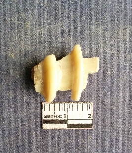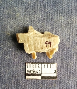 | Description / विवरण | The shell piece is pale white in color. It has surface striations on account of its natural formation. The piece has cut edges with angular points and some surface aberration. The piece is a by product of shell object making process. |