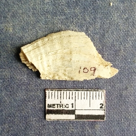 | Description / विवरण | The shell piece is pale white in color. It has surface striations on account of its natural formation. The piece has cut edges with angular points and some surface aberration. The piece is a by product of shell object making process. |