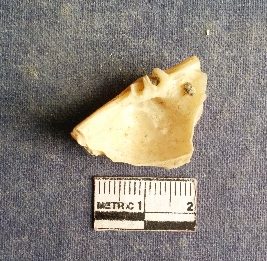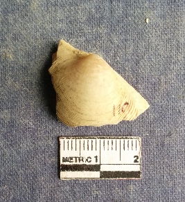 | Description / विवरण | The shell piece is pale white in color. It has surface striations on account of its natural formation. The piece has cut edges with angular points and some surface aberration. The piece is a by product of shell object making process. |