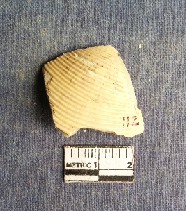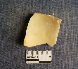 | Description / विवरण | The shell piece is pale white in color. It has surface striations on account of its natural formation. The piece has cut edges with angular points and some surface aberration. The piece is a by product of shell object making process. |