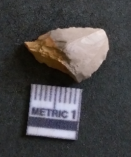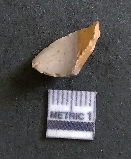 | Description / विवरण | The chert flake is roughly triangular in shape, with flake scars on the surface and sharp flaked edges as a result of flaking. The piece is pale in colour, with a bulb of percussion and sharp edges. |