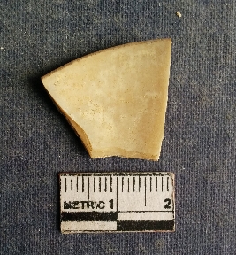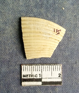 | Description / विवरण | The shell piece is pale white in color. It has surface striations on account of its natural formation. The piece has cut edges with angular points and some surface aberration. The piece is a by product of shell object making process. |
