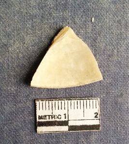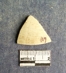 | Description / विवरण | The shell piece is pale white in color. It has surface striations on account of its natural formation. The piece has cut edges with angular points and some surface aberration. The piece is a by product of shell object making process. |