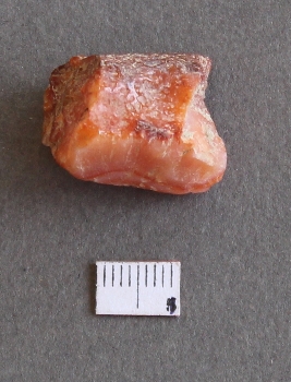 | Description / विवरण | It is jasper fragment, red in color with numerous flakes scars. |