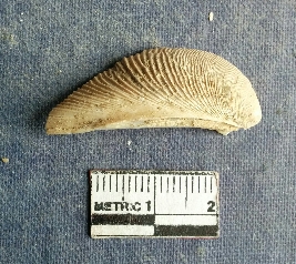 | Description / विवरण | The shell piece is pale white in color. It has surface striations on account of its natural formation. The piece has cut edges with angular points and some surface aberration. The piece is a by product of shell object making process. |