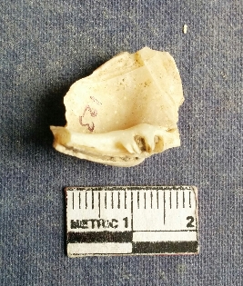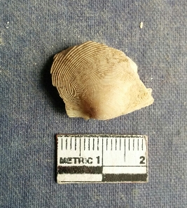 | Description / विवरण | The shell piece is pale white in color. It has surface striations on account of its natural formation. The piece has cut edges with angular points and some surface aberration. The piece is a by product of shell object making process. |