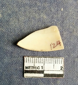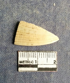 | Description / विवरण | The shell piece is pale white in color. It has surface striations on account of its natural formation. The piece has cut edges with angular points and some surface aberration. The piece is a by product of shell object making process. |