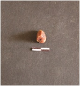 | Description / विवरण | Chert core fragment has flake scars and prepared platform. The colour is deep red for a chert piece. |
