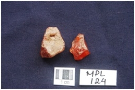 | Description / विवरण | Two Nodules with flake scars, by-product of stone tool manufacturing on Carnelian, one nodule is encrusted. |