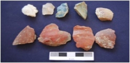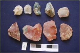 | Description / विवरण | Utilized flakes and cores with flake scars, made on Chalcedony and Agate, byproduct of stone tool manufacturing. |