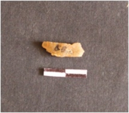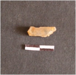 | Description / विवरण | The Chalcedony flake has a pointed end and flake scars on the surface. A small bulb of percussion is visible on the ventral face. |