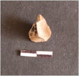 | Description / विवरण | The chert flake has a pointed end and a median ridge as a result of flaking. The dorsal side has numerous flake scars. |
