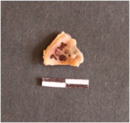 | Description / विवरण | The triangular flake of chalcedony has numerous flake scars and a deep bulb of percussion. |