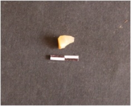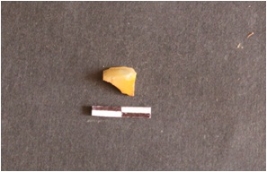 | Description / विवरण | Chalcedony flake with numerous flake scars on the surface and pointed end. |