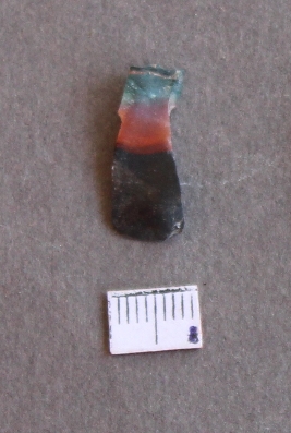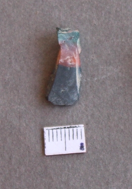| Description / विवरण | It is small jasper fragment, flake ridges on the surface with sharp edges, with copper impurities on one end. |