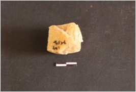 | Description / विवरण | The chalcedony chunk has numerous flake scars and is roughly cuboidal n shape. |