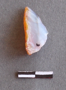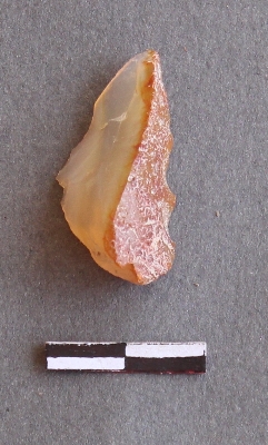 | Description / विवरण | It is a chalcedony fragment with a sharp point and a median ridge. Ripple marks are visible on the surface. Along with cortex. |
